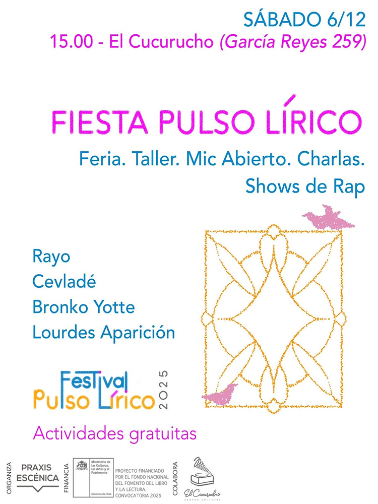 El festival Pulso Lírico despide su tercera edición con una gran jornada de poesía y rap, el sábado 6 de diciembre en El Cucurucho, ubicado en García Reyes 259. La Fiesta Pulso Lírico incluirá un taller de fanzines, feria de libros e ilustración, presentaciones de libros y shows de los raperos Rayokuza y Bronko Yotte.